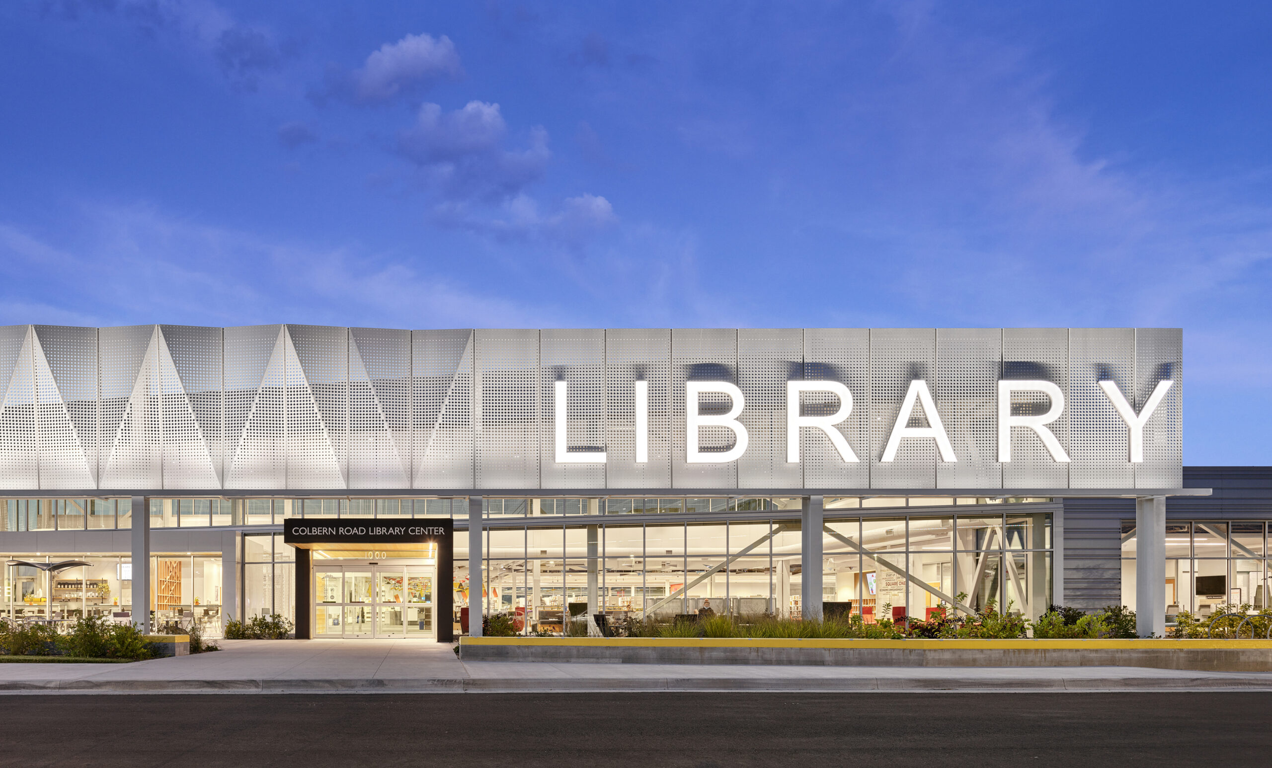 Colbern Road’s design is anchored by a faceted metal screen that wraps the upper volume of the building, filtering sunlight and establishing the library as a civic landmark. Inside, the design incorporates best practices of workplace design. Patrons of all ages are invited to create their own coworking space within the branch, working from a variety of postures and seating options throughout the building.